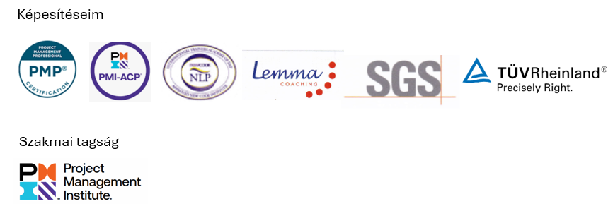 Nemzetközi PMP minősítéssel és Six Sigma Lean módszertani és ISO auditori végzettséggekkel rendelkezem. Végzett coachként, trénerként több éven keresztül tartottam multinacionális környezetben és a BGE-en projektmenedzsmenttel, piackutatással kapcsolatos órákat, tréningeket